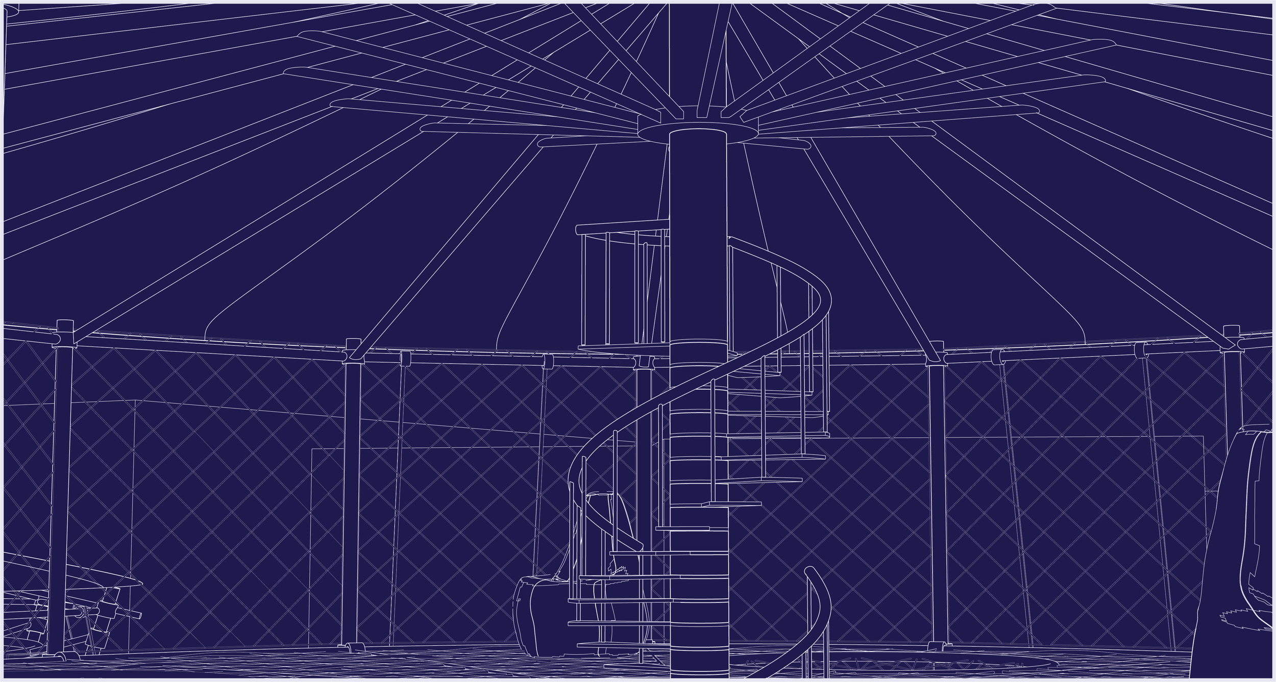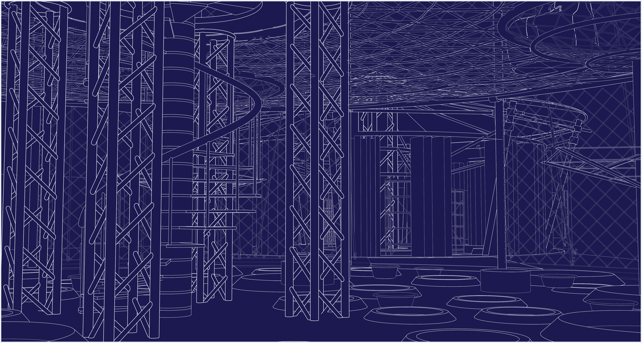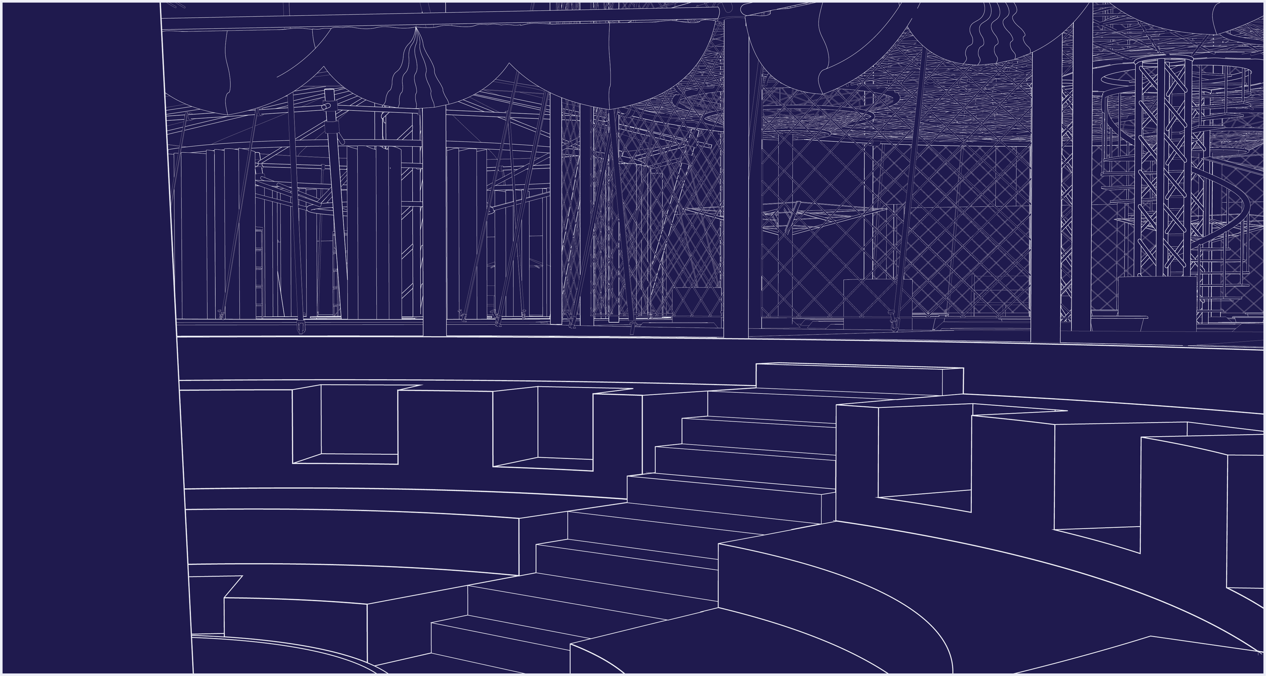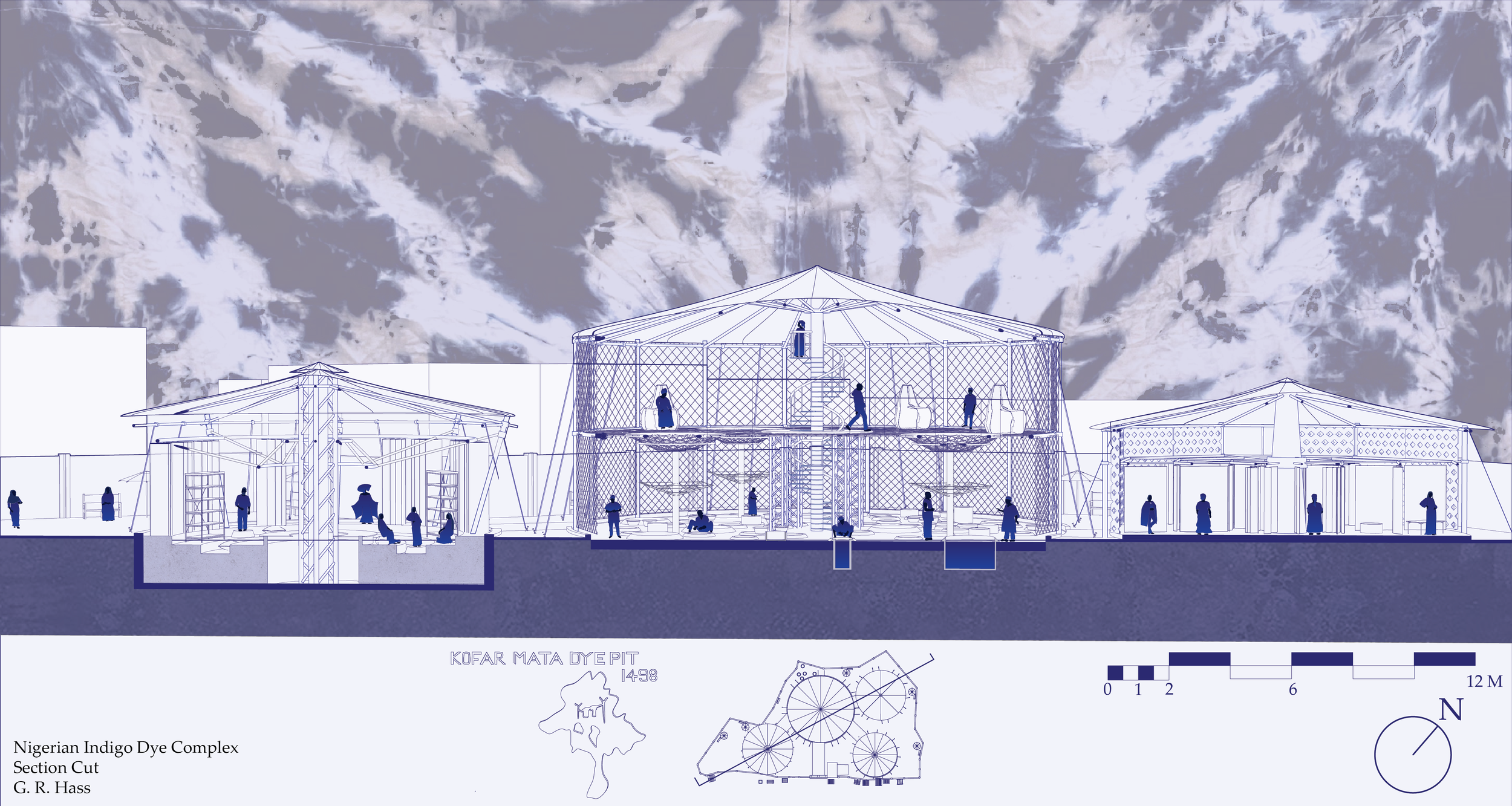 This project was meant as a more deliberate imagining of an archive that I had previously proposed within the class, a space in which you can be taken care of alongside the clothes that you have chosen to launder. The difference between the exercises was the decision to have it situated in an existing site rather than a blank void, thus choosing the proper site would be vital. I chose Kano, Nigeria (specifically the Kofar Mata Indigo Dye Pits) for its historical significance and global position as one of the last remaining and longest-standing natural dye pits in the world. The process is undertaken nearly exclusively by men and the existing facilities were unforgiving on the body, as the sun bore down on workers for hours at a time. By understanding what was there I proposed interventions that may make the process more preferable and also able to accommodate more members of the community in parallel process. Big-top architecture like that of Circus Tents was the inspiration, as you enter and look up it would appear like a spiderweb, held in radial spikes to house activity. A Three-Ring Circus emerged, with the idea that at each stage there was self-care taken alongside the dying process, Paraffin Wax Batik pattern making alongside salon waxing, tie-dye and resist string tying alongside hair braiding, dye pits and bathtubs side by side, finished fabric being tailored into garments and sold. Each step found its analog and made the complex more communally minded. With the representation, I chose to print and sketch on vellum to show the layers of systems at work to produce the center and the crossover of interests that can manifest. The durational map is a double-sided tie-dyed fabric sewn together to show the concrete and figurative concepts at play in the center, each strand of the web is held by a hand, from young to old with dyed, gloved, and wrinkled hands securing the web of production, and on the back is the concept as a pattern with each hand represented as a burst around a spiral.
